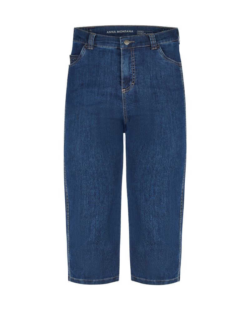 Den populära 5-ficksmodellen Anna Montana Dora jeans som Capri i 22 tums längd (56 CM). På myntfickan fram lite bling, bakfickor utan mönster/bling. Tygkvaliten heter Milano som är tunn och mjukare än den som heter London. Relativ hög midja och kort resår på sidorna ger en mycket bekväm passform.  Finns i flera färger.