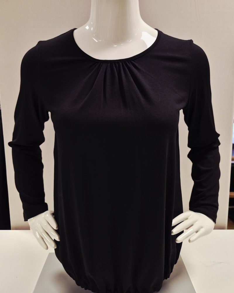 Topp Olivia har rund hals, lång armlängd och resår i nederkant som håller den på plats. Något veckad fram som ger fint fall. Svart som är tidlöst och passar i de flesta sammanhang. Längd bak i storlek M 62 cm. Material 96% Viskose 4% Elastan. Tillverkad i Europa. OBS! Då det är resår i nederkant så blir den kortare i längden.