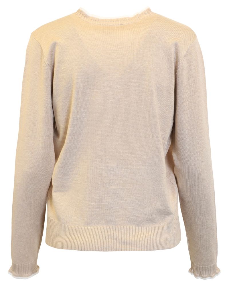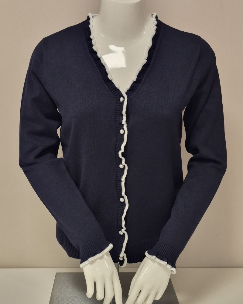 Elegant cardigan i lite mörkare sandfärg med en söt kråsad kant i hals och ärmslut. Runda pärlemor knappar. Finns även i marinblå.