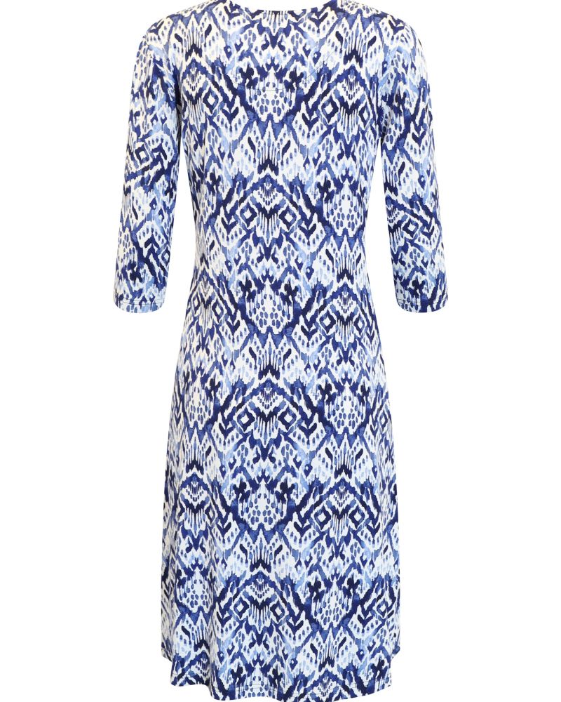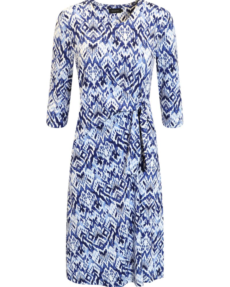 Skön klänning med ett band i sidan där du själv kan knyta som du vill. Olika blå nyanser på vit botten och 3/4 ärm. Rund halsringning.