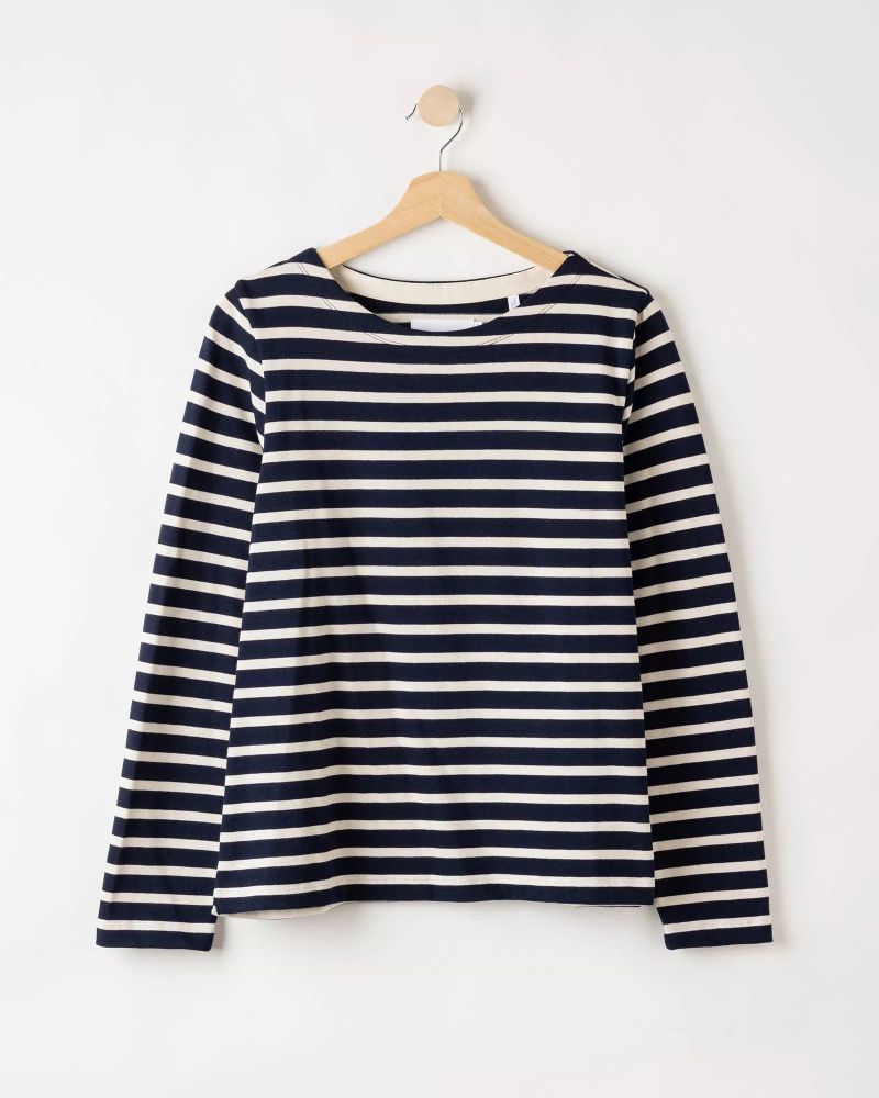 Randig tröja i 100% bomull med klassisk båtringning. Tillverkad i ”heavy weight” bomull, vilket innebär en något tjockare, men sval kvalitet. Normal passform och små slitsar i sidorna. Hållbart producerad i Europa.