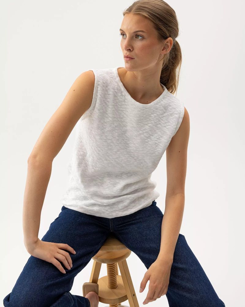 Stickad ärmlös topp i 100% bomull. Stickad i ett oregelbundet garn som ger en fin struktur. Normal, lätt a-linjeformad passform, rund halsringning och nätta avslut. Hållbart producerad i Europa.