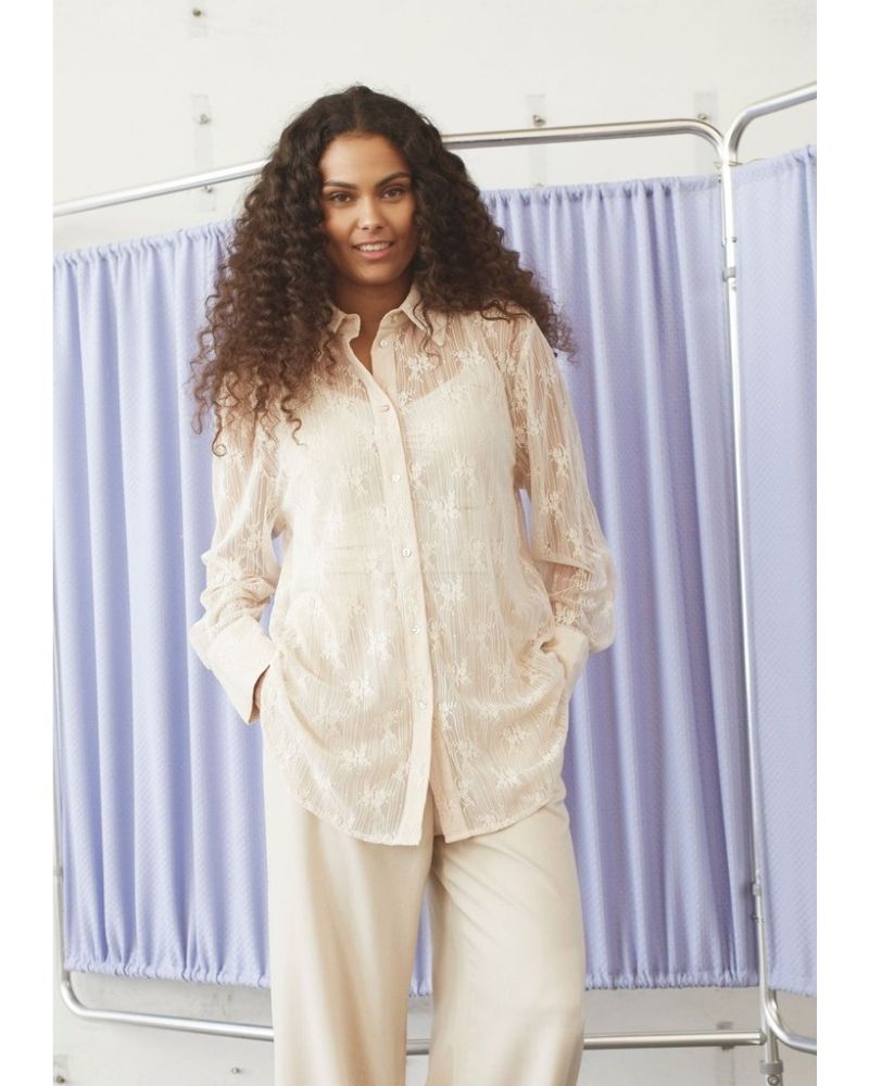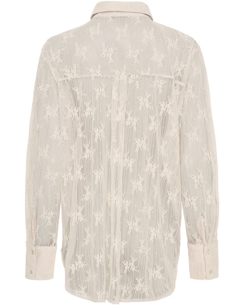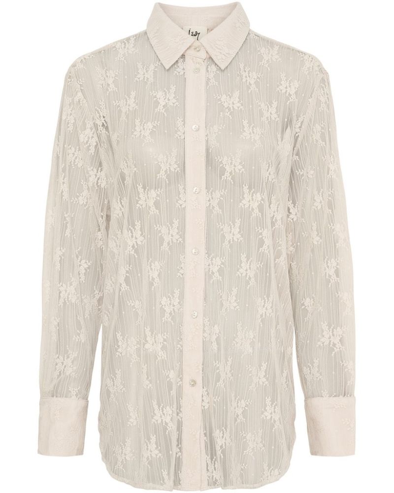Blusen är en lätt och luftig spetsskjorta som utstrålar elegans och komfort. Den rena kvaliteten gör skjortan perfekt för skiktning, och den känsliga blommiga spetsen skapar en feminin look. Skjortan har en klassisk skjortkrage, knappar i pärlemor och långa ärmar med manschetter, vilket ger struktur till den annars mjuka looken.