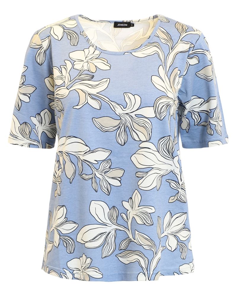 Mjuk bomullstopp med blommor i offwhite på ljusblå botten. Rak i modellen, rund hals och kort ärm som slutar ungefär i armvecket.