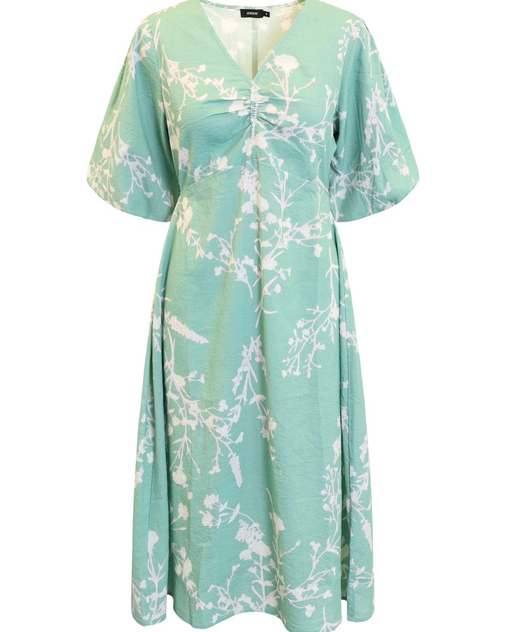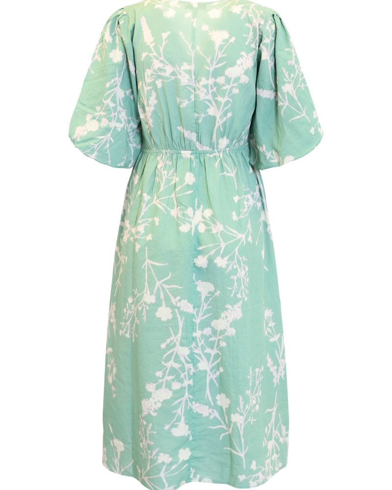 Ljuvlig klänning i 100% bomull. V-ringad i hals med liten resår fram. Kort ballong ärm med puff vid axel. Fin ljus grön färg på botten med mönster i offwhite och väldigt svagt lila. Resår i midjan baktill.