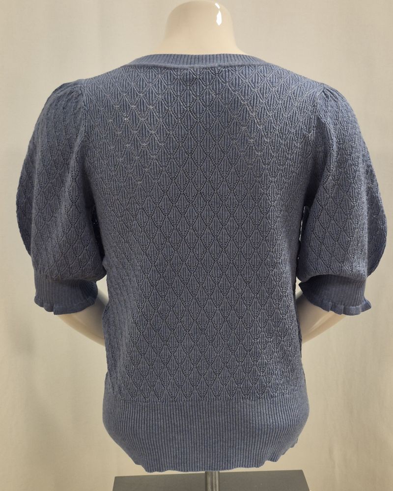 Tunnstickad pullover med fina mönster. Rundad hals och söt puffärm med bred mudd. Nertill på tröjan finns en bred fin mudd. Finns i färgerna blå, offwhite och grön.