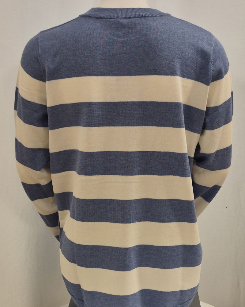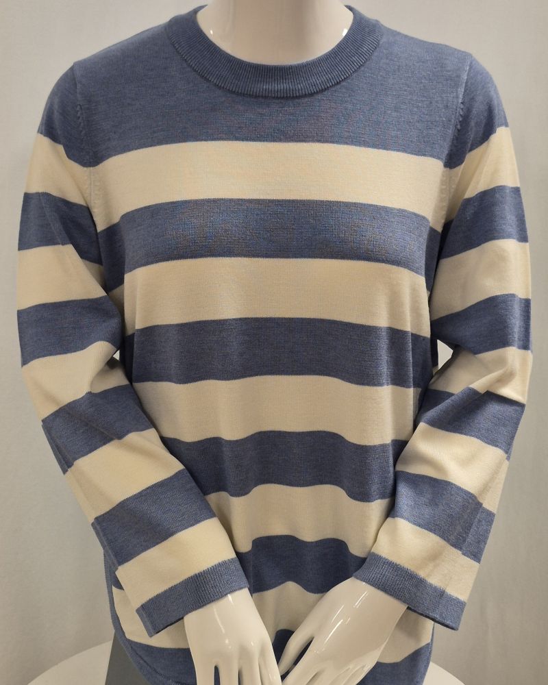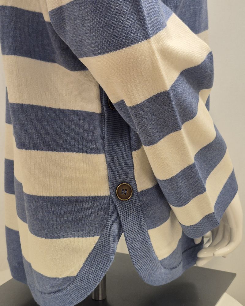 Snygg pullover med lite längd. Något rundad nertill med dekorativa knappar i sidorna. Fina breda ränder.