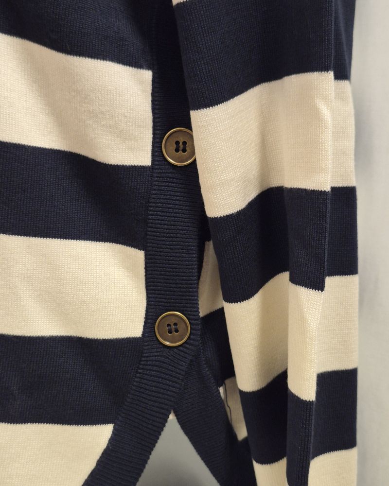 Snygg pullover med lite längd. Något rundad nertill med dekorativa knappar i sidorna. Fina breda ränder.
