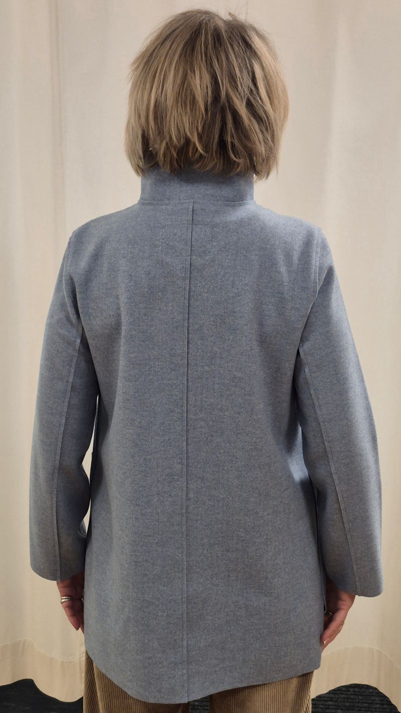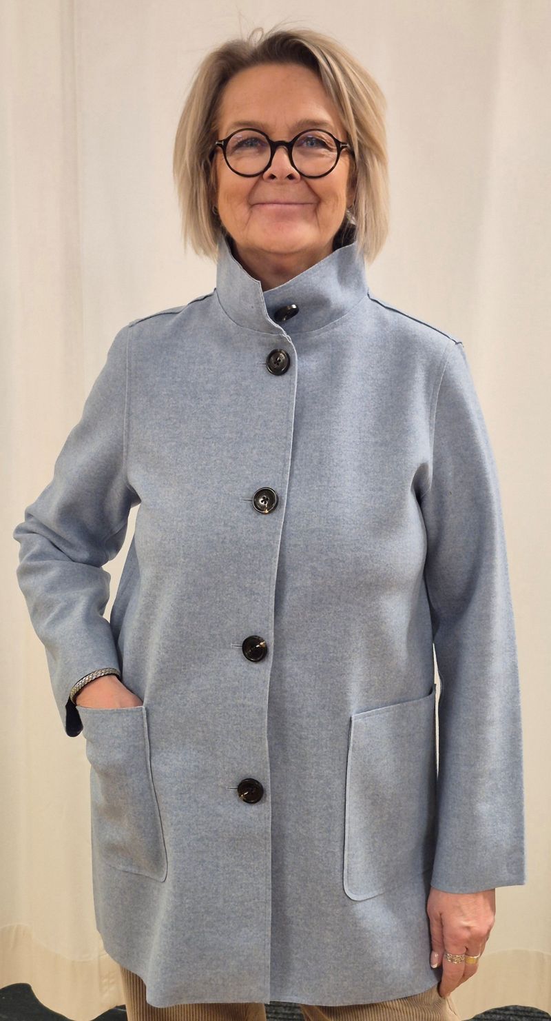 Stilren och mjuk kappa utan foder. Fin stå krage och tuffa stora fickor fram. Rak i modellen. Finns i Olivgrön, rosa och himmelsblå.