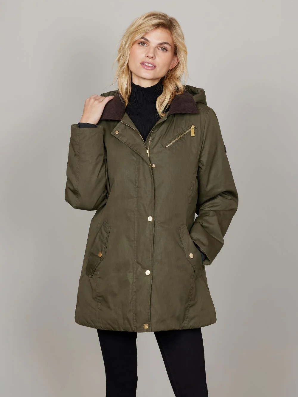Jackan har både dragkedja och knäppning framtill för ökat skydd mot väder och vind. Rymliga framfickor fodrade med mjukt, varmt tyg ger komfort, medan vindmuddar hjälper till att stänga ute kylan. Mässingsfärgade metalldetaljer fulländar designen med en elegant, rustik touch.