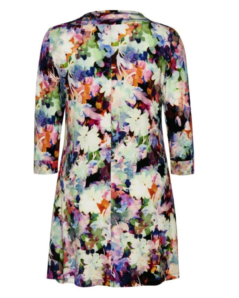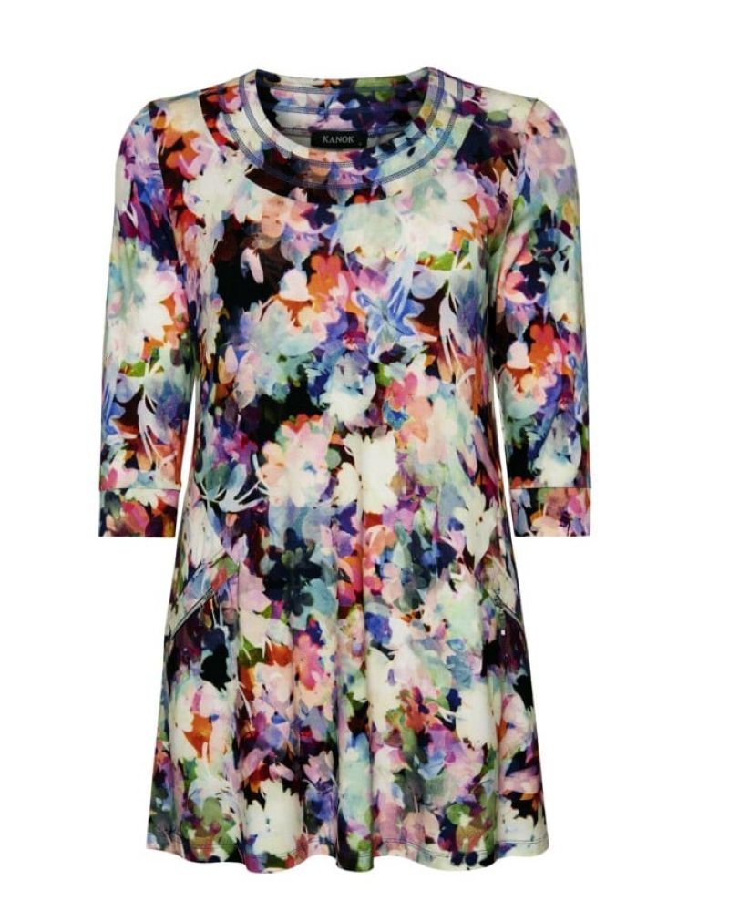 Härlig tunika i mjuk trikå från Kanok. Denna heter Sandy och är rundad i halsen och har två dekor dragkedjor framtill. Formen är A-ställd.