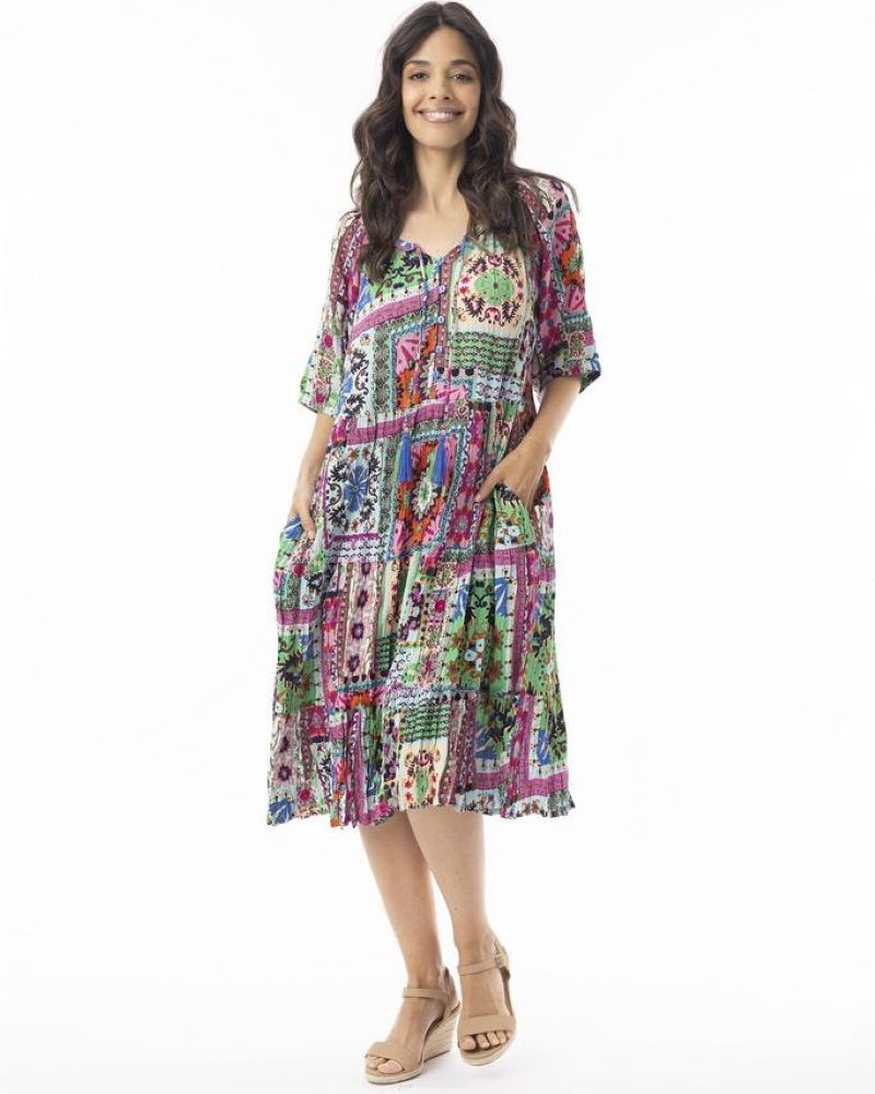 Denna fantastiska klänningen har motveck runt den runda halsringningen som är toppen om du kräver utrymme över ryggen eller över bysten. Tyget är kreppat och lätt skrynklat och har en a-linje form med utsvängd nederdel. Ärmen når till armvecket. Fickor i sidan. Rymlig i storleken.