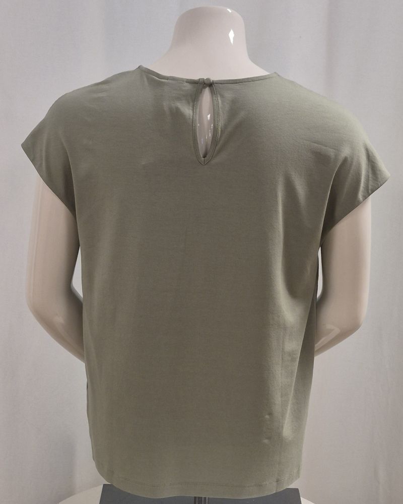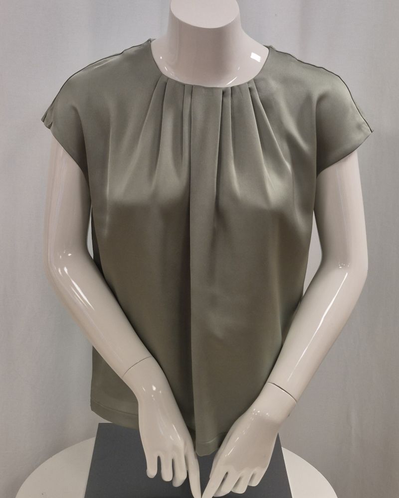 Vacker blus från Ril`s. Framsidan med fina motveck i den rundade halsrigningen. Tyget är blankt och elegant. Baksidan i mjuk viscose med klädd knapp i nacken. Kort holk ärm. Finns även i färgerna offwhite och gammelrosa.
