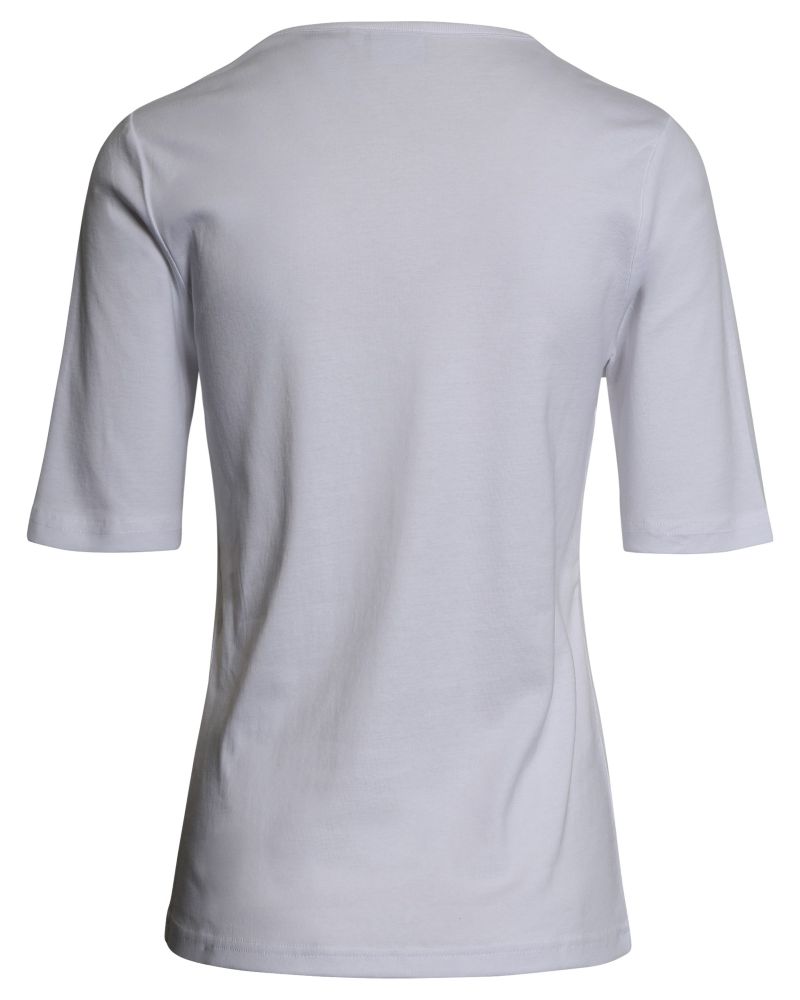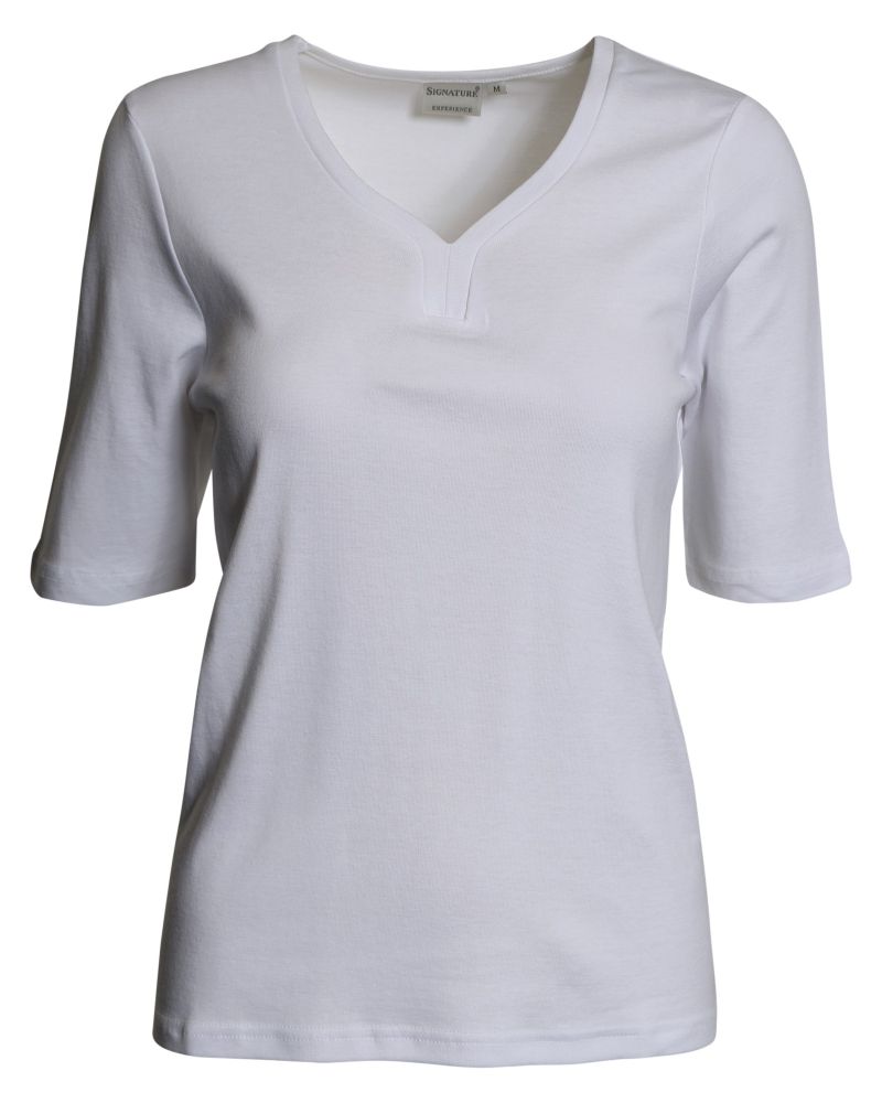 Bas t-shirt i bomull från Signatur. Denna t-shirt har en fin halsringning. Urringningen ger t-shirten en feminin look och erbjuder en lätt och bekväm kvalitet. Använd den under en fin kofta och till ett par jeans. Modellen är 175 cm lång i storlek. M. Finns i vit, marinblå, himmelsblå och rosa.