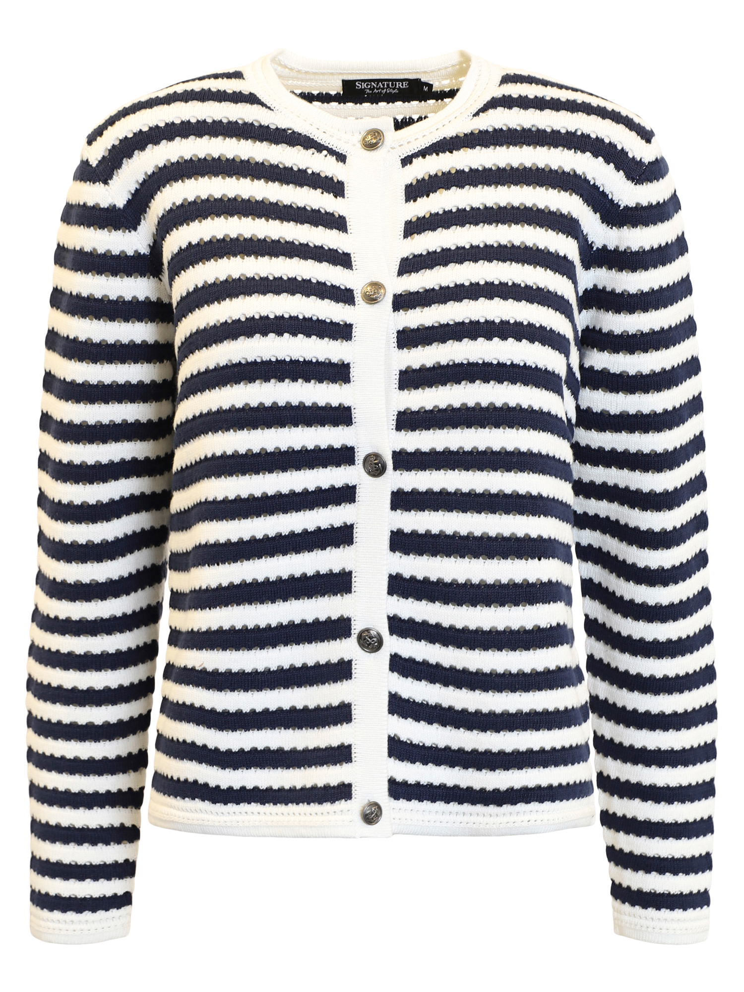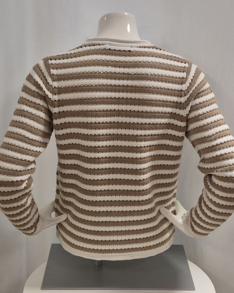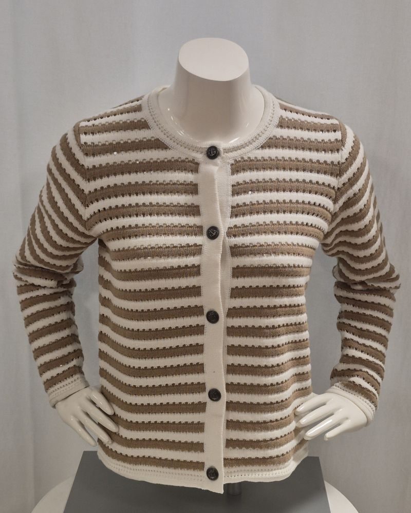 Stickad kofta med ränder i Camel och offwhite. Fina knappar med marint tema och rak i modellen. En smidig cardigan med lite tyngd av bomullen. Kan lika gärna användas som en Jacket. 58 cm i ryggen . Finns även i marinblå/offwhite.
