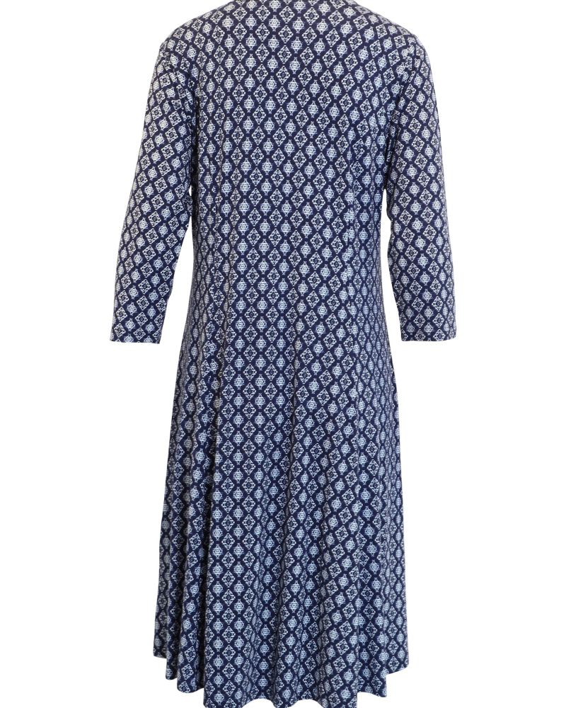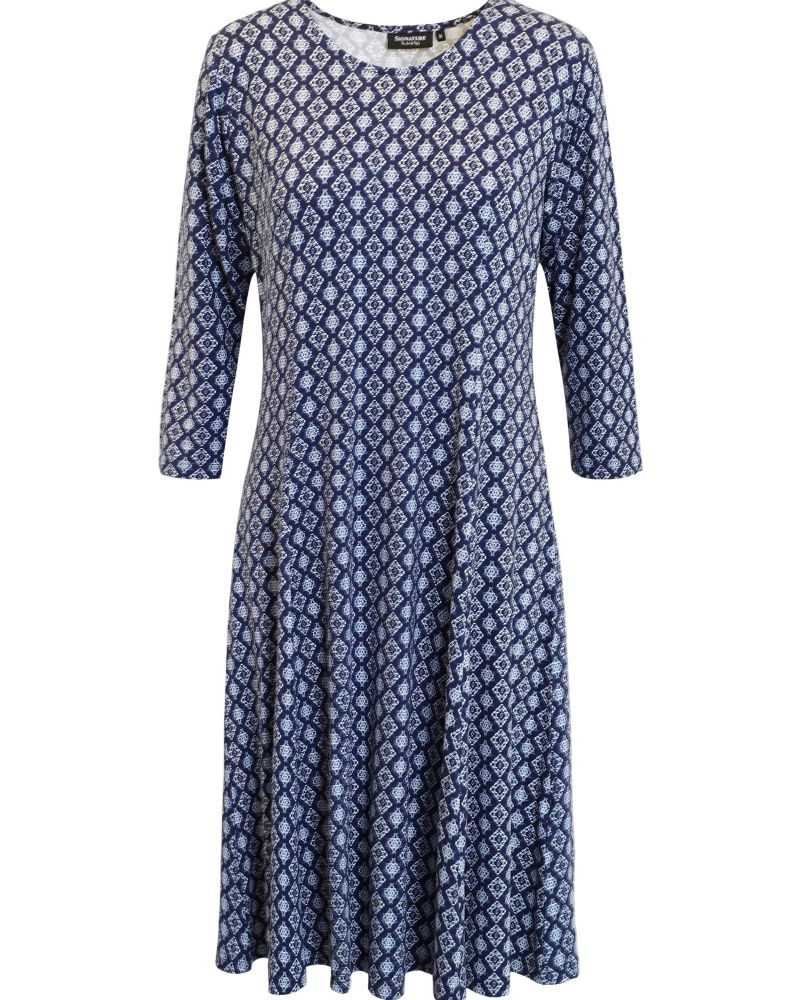 Mjuk och skön klänning som ger ett fint fall . Urringad hals och med 3/4 ärm. Klockad nederdel.