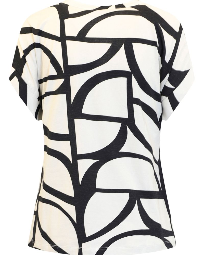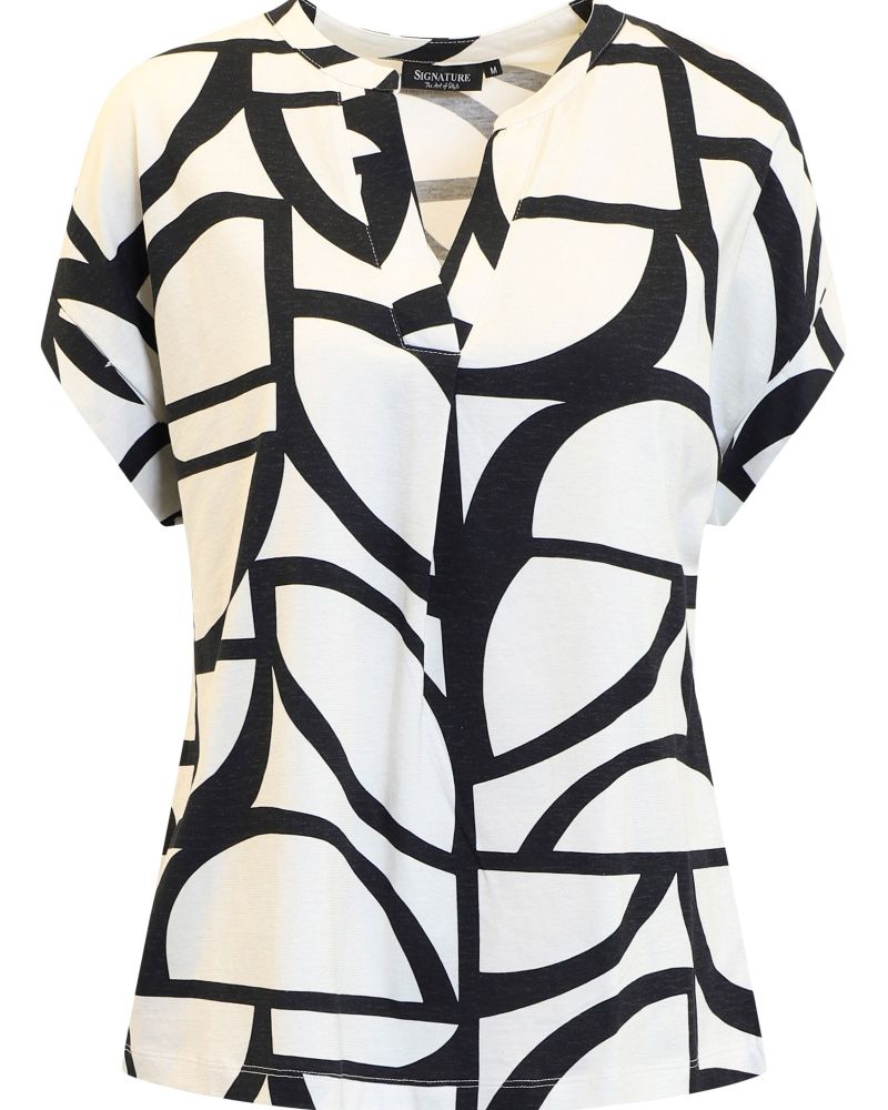 Stilren topp med ett abstrakt mönster för den som inte gillar blommönster. Toppen har kort ärm och fin v-hals med ett litet motveck. Svart mönster på offwhite botten.