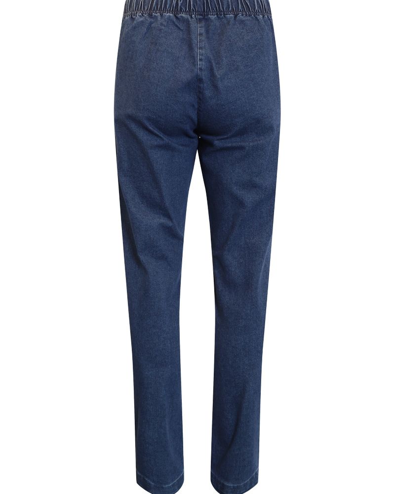Sköna ”dra på jeans” med resår i midjan och två fickor fram. Ingen dragkedja eller knapp. Bra skön stretch och som passar de flesta kroppstyper. Mörkblå färg som är gångbar året runt. Finns även en ljusare variant, men endast i vår butik i Borlänge. Mycket prisvärda jeans sett till kvalitén och passform.