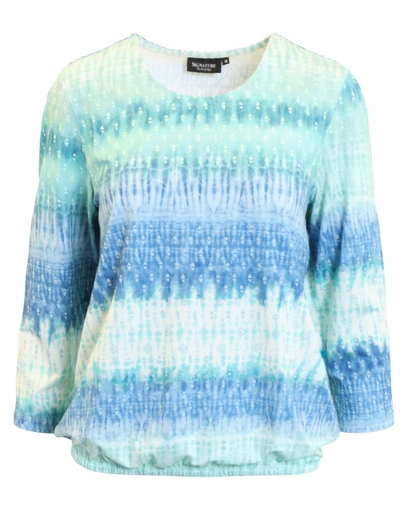 Skön topp i nyanser av turkos och blå. 3/4 ärm och resår nertill på toppen. Blir snygg till jeans eller ljusare byxor.