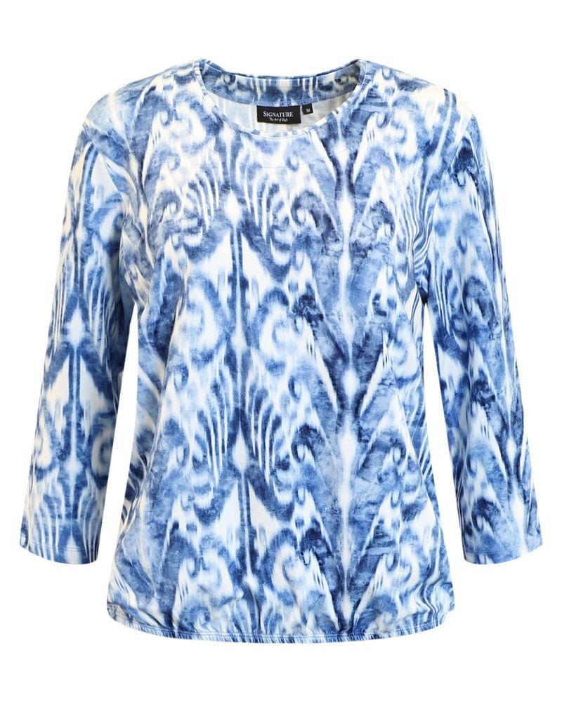 Snygg topp med högt skuren halsringning. Resår i nederkant och med 3/4 ärmar.