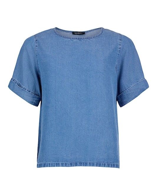 Snygg, enkel och stilren blus i ljus jeansfärg. Rundad hals och slag på ärmar. Liten slits i sidorna.