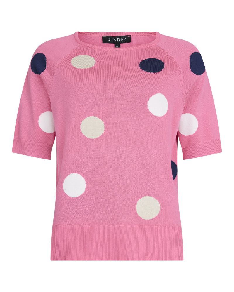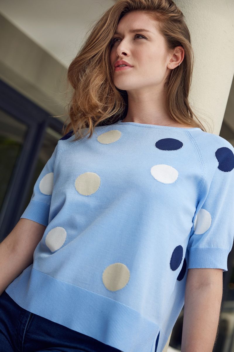 Tunn stickad jumper  i Himmelsblått med roliga prickar i vitt, sand och marinblått. Kort ärm med lite längre mudd i ärmslut och en sprund i nederkant.