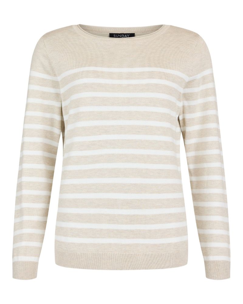 Randig pullover i fin sandfärg som påminner oss om stranden. Pullovern har lång ärm med liten mudd i ärmslutet. Söt halsringing med rullkant.