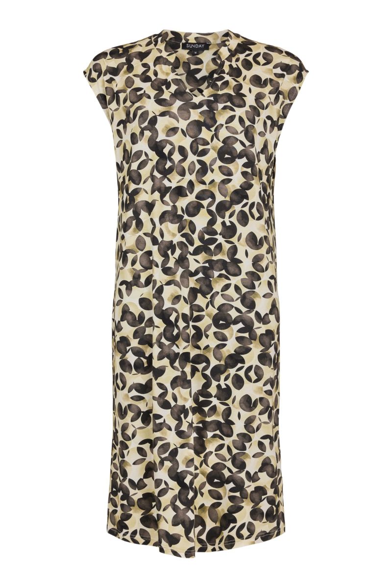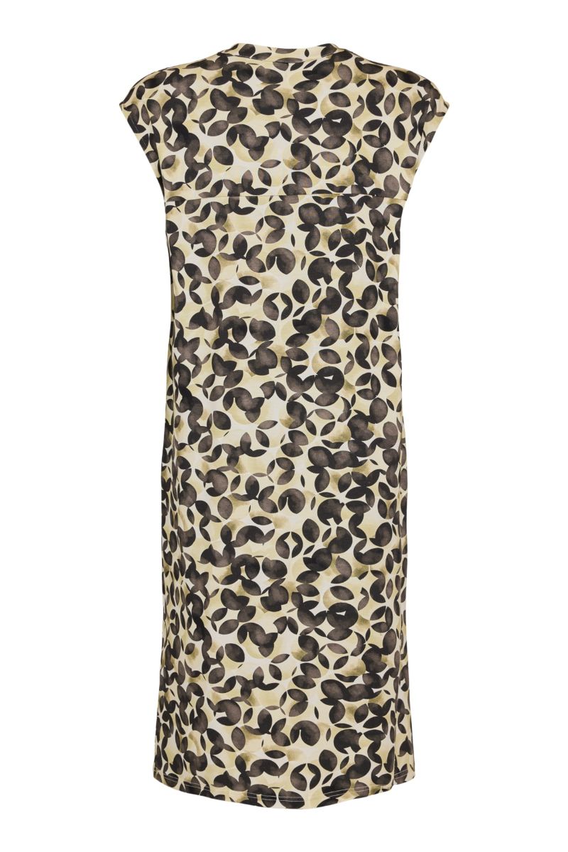 Mjuk och härlig sommar klänning i skön viskos. Kinakrage, utan ärm och rak i modellen. Färgerna går i sand, grönt och svart.