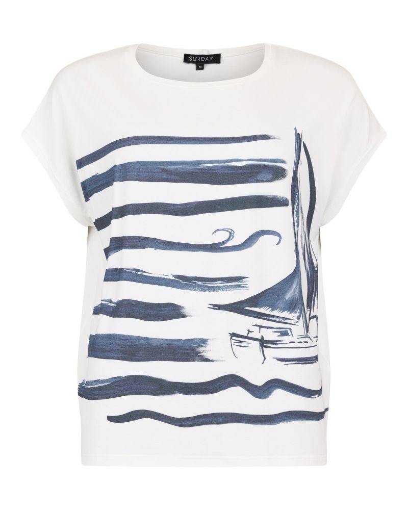 En fantastiskt mjuk t-shirt i mjukaste viskos. En boxtopp med holkärm. Trycket i fina blåa färger föreställande en segelbåt. Snygg till marinblå byxor eller varför inte till ett par jeans.